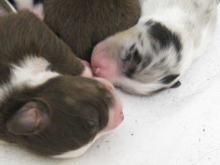 > 16.05.2010 : Nachdem die ersten Welpen ihr Geburtsgewicht bereits gestern verdoppelt haben, konnte dies beim Rest des Wurfes bei der heutigen, morgendlichen Wiegeaktion ebenfalls festgestellt werden. Die Näschen färben sich immer dunkler, auch die Ballen beginnen, erste Pigmentflecken aufzuweisen....der bunte Wurf wird langsam immer bunter ;-)